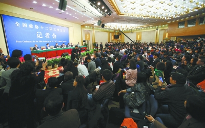 全国政协十二届五次会议举行记者会,全国政协委员刘长乐、冯骥才、苏士澍、成龙、海霞回答记者提问记者会现场。 本报记者卢旭摄