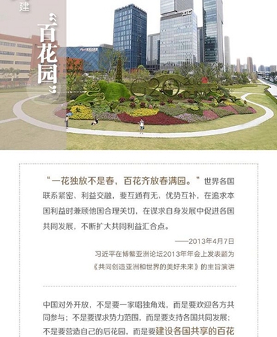 2013年 博鳌亚洲论坛年会开幕式上,习近平作主旨演讲时说,“一花独放不是春,百花齐放春满园”。同年 9月G20峰会上,习近平再次引用这一诗句,进一步阐明中国对外开放、合作共赢之理念。