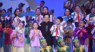 谷建芬走上舞台和孩子们共同演唱