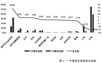 通过对比分析中国青年阅读指数4月和5月的数据发现,从阅读需求的角度来看, 哲学及社会科学阅读域逐渐受到青年读者的青睐,文学阅读域需求量逐渐下降。哲学及社会科学需求指数从4月的12.87上升至5月的31.56,上升幅度最大,达到 18.69。需求指数上升的阅读域还有经济金融管理阅读域(上升 3.97)、艺术阅读域(上升 3.64)和历史阅读域(上升3.40)。文学阅读域指数从 4 月的 55.39 下降至5月的38.42,下降幅度最大,达到16.97。此外,工学阅读域需求指数下降11.73,教育阅读域需求指数下降1.28,自然科学阅读域需求指数下降 0.57。新闻传播广告、语言学、法学阅读域需求较稳定,两月指数变化不大。