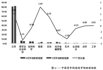 通过对中国青年阅读域市场映射热度分析发现,文学阅读域最具热度,且市场映射指数由4月的80.94上升至5月的81.99,上升 1.05。此外,教育阅读域市场映射指数上升最快,由4月的1.43上升至5月的 3.03,上升1.60;哲学及社会科学阅读域市场映射指数下降最多,由4月的6.31下降至5月的 5.08,下降 1.23。