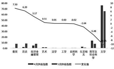 从新书供给的角度来看,教育阅读域供给量增加,文学阅读域供给量减少。教育阅读域指数从4月的0.05上升至5月的7.55,上升幅度最大,达到7.5。供给指数上升的阅读域还有历史(上升6.20)和经济金融管理(上升3.17)。文学阅读域指数从4月的 75.94 下降至 5 月的 65.69,下降幅度最大,达到10.25。此外,哲学及社会科学阅读域供给指数下降 5.48,生活相关阅读域供给指数下降1.64。艺术、法学、工学、自然科学阅读供给量较稳定,两月指数变化不大。