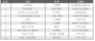 尤其是《中国诗词大会》最后一期播出时,在当当网实时更新的新书热卖榜中,以“近30日”为维度的排行中,《中国诗词大会》(上下)2本书分别位于 26、29名,以“近24小时”为维度的排名中,纷纷飙升至10名左右,而在2016年这2本书则在百名开外。可以说,《中国诗词大会》节目的热播直接带动了同名图书的热销,并且带动了文学、教辅、童书的销售热潮,其中《人间词话》《笠翁对韵》《诗经》《唐诗三百首》等图书销量上升明显。