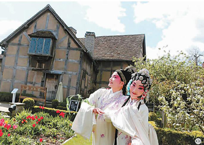 为纪念汤显祖和莎士比亚逝世400周年,来自汤显祖的故乡中国江西抚州的演员在英国莎士比亚故居花园表演戏曲(新华社发)