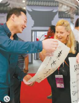 第十二届北京文博会上,一名斯洛文尼亚观众被中国书法吸引(光明图片/视觉中国)