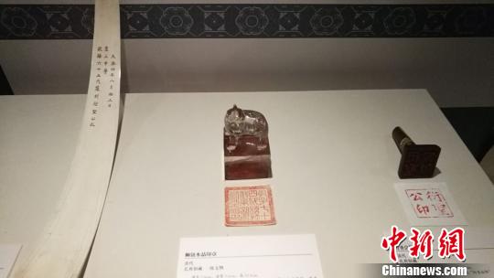 "孔府珍藏文献展"的文物,其中左边的明天启时期象牙笏板是国家一级文物,也是首次走出孔子博物馆。其上部竖刻楷书三行“天启四年八月初三日皇上幸学钦赐六十五代袭封衍圣公孔” (应妮/摄)