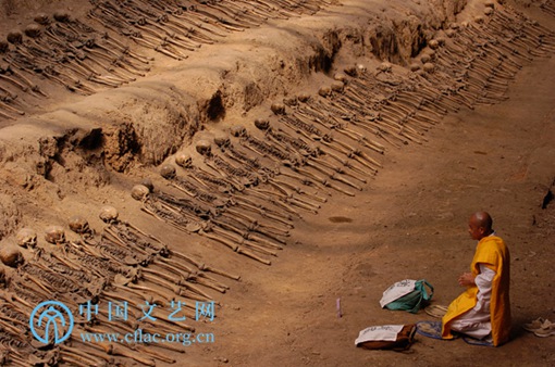 2007全国摄影艺术展览《谢罪之旅》(郭亮/摄)2006年5月9日,日本僧人岩田隆造来到辽宁省辽阳市的“万人坑”。他在累累白骨前跪拜诵经,为亡灵祈祷忏悔。这里埋葬着数千具中国劳工的尸骨,见证着日本帝国主义侵略中国的罪证。