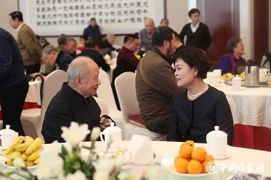 在喜庆欢快的乐曲声中,铁凝和钱小芊等中国作协党组书记处同志来到老作家老同志身边,同大家亲切握手,问候交谈,向大家致以诚挚的新春祝福。老友新朋聚在一起总有聊不完的话题,说不尽的故事,叙不完的情谊。大家互赠新书,拍照合影,回顾过去一年中国文学繁荣发展所取得的成就,为新一年文学事业和作协工作提建议谈希望。不忘初心,砥砺前行,这是广大作家和文学工作者的心声,也是中国文学由“高原”向“高峰”迈进的强大动力。