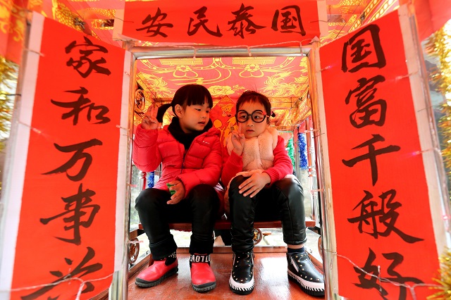 2月21日,一年一度的中国客家狂欢节在福建省连城县举行,当地群众以独特的“走古事”客家风俗欢庆中国传统的元宵佳节。图为连城县罗坊乡两名女孩坐在花轿中等待巡游 (摄影/彭张青 )
