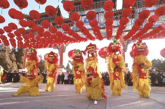 新春佳节,北京各类庙会张灯结彩。 图为演员在北京地坛庙会上表演舞狮 (摄影/陈晓根)