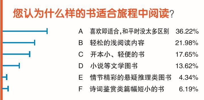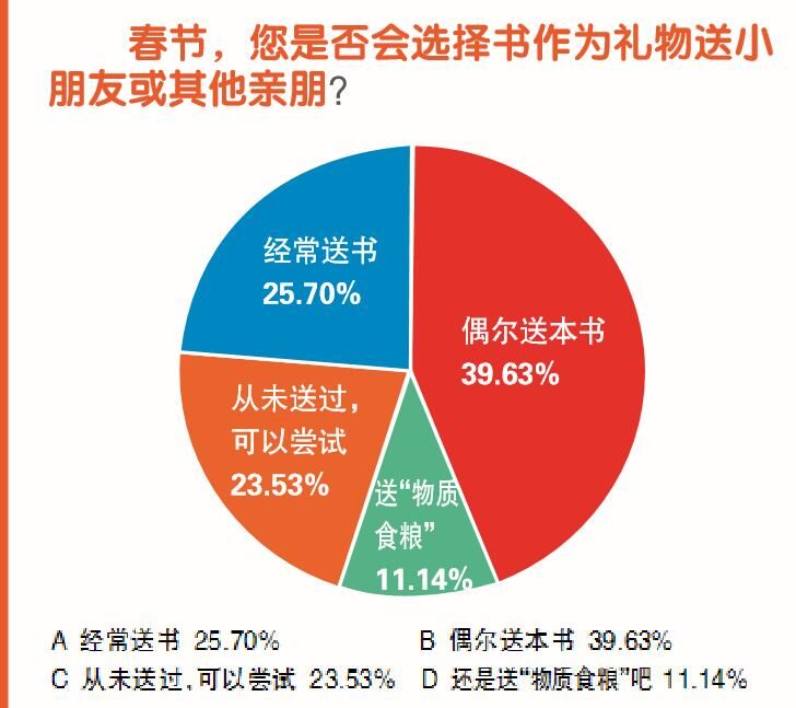 春节前后,中国新闻出版广电报微信公众号推出春节与阅读问卷调查,就是否选择让阅读陪伴旅程、是否会选择图书作为礼物等问题进行调查。调查显示,51.39%的人选择路上带本书;36.22%的人认为旅程中的阅读与平时没太大区别,21.98%的人选择在路途中进行轻松的浅阅读,17.65%的人选择在路上读开本小、轻便的图书,13.62%的人旅途中看小说等文学图书,4.34%的人读悬疑推理类图书,6.19%的人选择诗词鉴赏类篇幅短小的图书。数据同时显示,25.70%的人经常把图书作为春节礼物送亲朋,23.53%的人没有在春节期间送过图书但表示可以尝试。分析调查数据我们认为,经过10余年的阅读推广,全民阅读已经较大范围地融入百姓生活,与此同时,阅读呈现出个性化、多样化特点,阅读推广、图书推荐都存在较大空间。