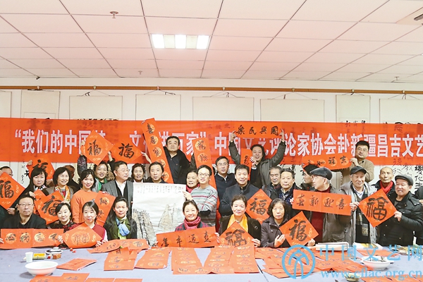 1月25日,气温骤降到零下27度,天还没亮,空中仍飘着雪花,中国评协文艺志愿服务小分队就驱车前往阜康市开展一系列文化活动。在阜康市博格达书院,小分队与当地文艺工作者、文艺爱好者进行联欢和互动交流,开展写“福”字送春联活动,慰问社区文艺工作者。多才多艺的文艺志愿者与阜康文艺爱好者同台高歌,不同地域、不同民族的歌声交融在一起,汇聚成欢乐的海洋。