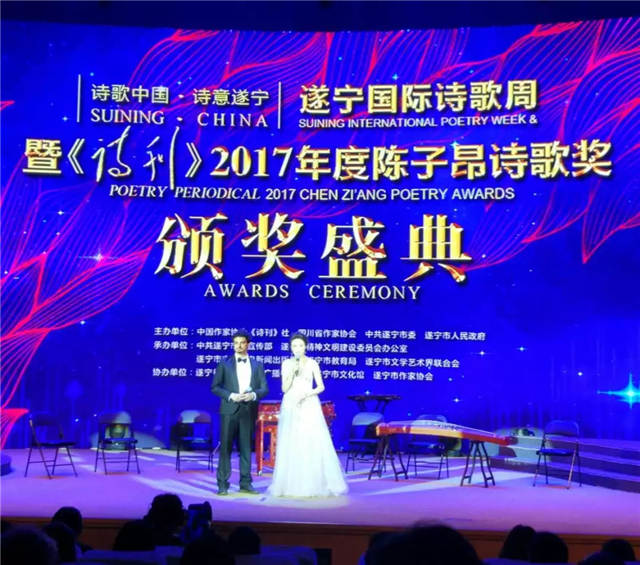 3月23日,由中国作家协会《诗刊》社、中共遂宁市委、遂宁市人民政府主办,中共遂宁市委宣传部、遂宁市文化广电新闻出版局、遂宁市文学艺术界联合会承办的《诗刊》2017年度陈子昂诗歌奖颁奖会在遂宁国际会展中心隆重举行。来自国内外的著名诗人、批评家、翻译家齐聚观音故里。