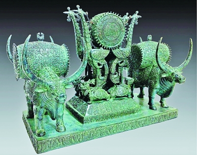 在展厅中央,一件青铜作品《欢乐鼓》引来不少观众驻足观看。《欢乐鼓》由贵州布依族工艺美术大师刘雍创作,由一个主鼓和两个副鼓组合而成,主鼓悬挂在由四只凤凰和四只龙头龟构成的鼓架上,鼓的正面镌刻着贵州的象征——黄果树瀑布,鼓的背面是传统的铜鼓图案,鼓身上遍布着日、月、鱼、龙等吉祥纹样;鼓的周边布满了芒刺,借鉴于布依族传统的主打乐器——刺鼓。两个副鼓分别由两只双头牛驮负,鼓和牛全身遍布着贵州特有的传统民族图案,强化了作品的民族特色。