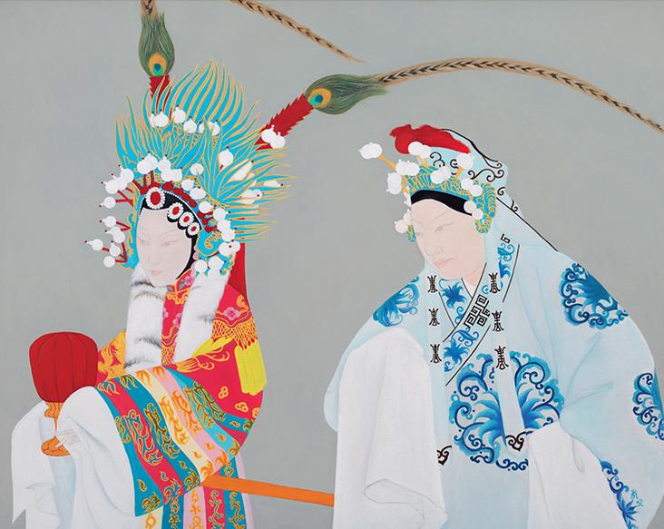 画家李昕毕业于中央美术学院油画系第一工作室,师从靳尚谊、孙为民、杨飞云等,为邮资票品的专业设计师。她热爱戏曲,擅长“戏画”,对戏曲服装、装扮、舞台手型动作等细节的描绘观察入微,笔下戏曲人物鲜活灵动。此次展出的纸本水彩、布面油画作品,如《韵》系列、《原来姹紫嫣红开遍》组画布系列,都取材自京剧元素。“我既不想太写意,失其细节;又不想太写实,损其神韵。”李昕说,自己想体现中国传统审美中平面与夸张的魅力,“因此遇到一些技术问题时,我会放下,先专攻技术”。油画《游园惊梦》中的衣纹需要勾线,她就从临摹《八十七神仙卷》开始,连画了三年白描;戏服上有繁复的花纹,就干脆找来中国传统纹样的图谱进行学习,探究它的规律和寓意。“戏中所有动作都是人格与精神的传达,如果只是戏耍一样地热闹好看,就不必这样津津乐画了。”