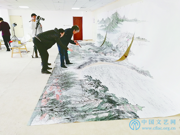 创作需要有进度,也需要有质量。青岛市文联重点调度,连续组织专家到创作现场为艺术家解决创作中遇到的问题。为了保证进度,有的艺术家春节期间仍然在单位创作,放弃了与家人团聚的时间。青岛市文联第一时间为所有艺术家送上新年祝福,春节前后走访了参与创作的艺术家,进一步加强沟通。在上级美术品创意设计工作小组的领导下,近三个月的时间里,青岛及青岛籍艺术家顺利完成青岛国际会议中心、燕岛宾馆、八大关宾馆、机场贵宾室等场馆一百余幅创作任务,展现了书画艺术的独有魅力。