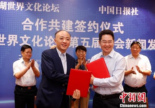 8月28日,太湖世界文化论坛与中国日报社合作共建签约仪式暨第五届年会新闻发布会在北京举行。据悉,太湖世界文化论坛将于10月17日-19日在北京召开以“文化对话:构建人类命运共同体”为主题的第五届年会。图为合作共建签约仪式。(中新社记者/韩海丹/摄影)
