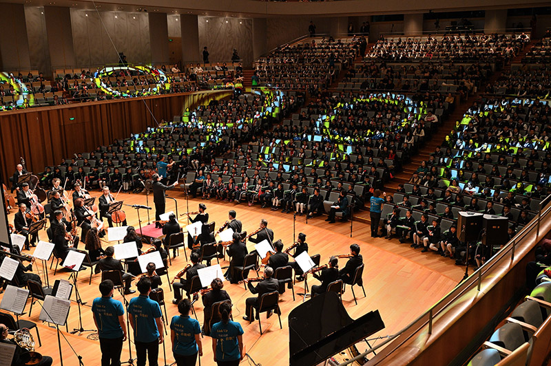 音乐会伴随着耳熟能详的《茉莉花》旋律开始。北京市第一六六中学附属校尉胡同小学合唱团与中国电影乐团在台上演绎,观众席上的小观众也跟随指挥一同合唱。这正是国家大剧院与美国卡内基音乐厅联合研发的青少年音乐普及课程《LinkUp:管弦乐团在歌唱》中新的美育模式。