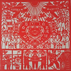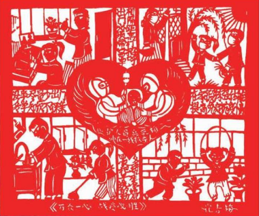 2020年春节,我国爆 发新型冠状病毒肺炎疫情,以习近平同志为核心的党中央发出号召,全国人民万众一心,抗击疫情。医疗战线紧急驰援疫情重灾区,其他行业如何动作呢?南京大学 文化与自然遗产研究所做出了示范,他们在做好自身防护的同时,发动全国民间剪纸非遗传承人拿起手中的剪刀献大爱,以剪驰援,以传统的民族民间文化为武器, 运用中国非遗剪纸的语言、符号、寓意等元素创作出一批精品力作,向奋战在疫情一线的勇士们表达问候,给疫情严重的地区加油鼓劲。