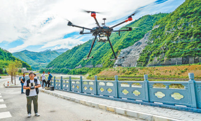 陕西省汉中市,无人机驾驶员操控无人机,借助北斗卫星导航系统,对Ⅰ级防洪点危岩山体进行视频和图片数据采集。人民视觉