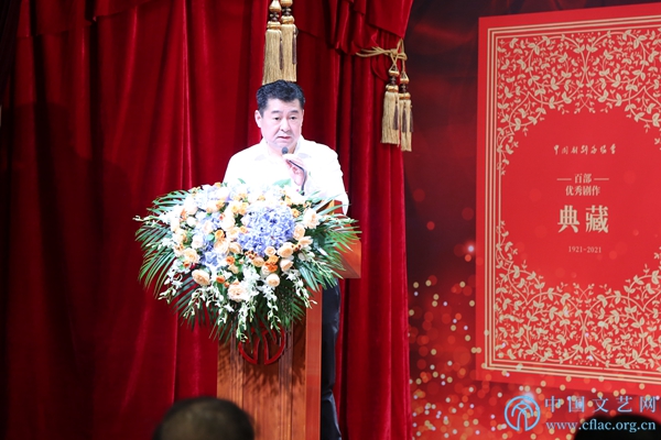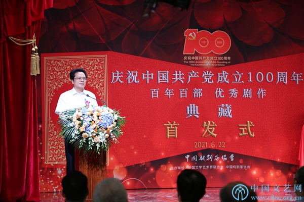 6月22日,庆祝中国共产党成立100周年《百部优秀剧作典藏》首发仪式在京举办。图为中国文联党组书记、副主席李屹讲话。中国文艺网 马征 摄。