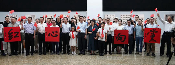 展览现场,大家倾情演绎《没有共产党就没有新中国》,以快闪的形式为书法展带来别样的文化色彩。展厅内一片沸腾,所有人都加入到快闪活动中,大家一边挥舞党旗,一边放声歌唱。歌声与乐曲共鸣,笑脸与党旗辉映,4位书家手持展示书写的“红”“心”“向”“党”四个大字的展览标题,为快闪活动烘托浓烈的艺术氛围。