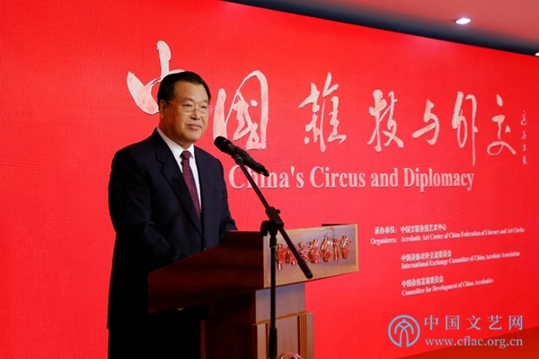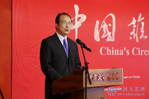 7月20日,“中国杂技与外交”图片展览在中国文艺家之家展览馆开幕。图为中国文联党组成员、书记处书记张雁彬在开幕式上讲话。