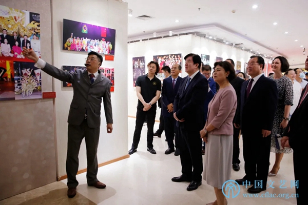7月20日,“中国杂技与外交”图片展览在中国文艺家之家展览馆开幕。图为领导嘉宾参观展览。