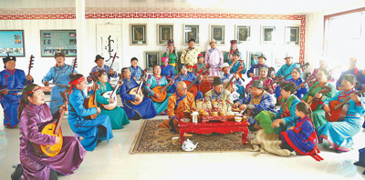 悬挂着鄂尔多斯“乃日”(蒙古语意为娱乐)传习所牌匾的蒙古包毡房内,一位老人正在指导数十名学员演奏民族器乐曲。