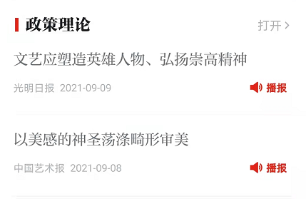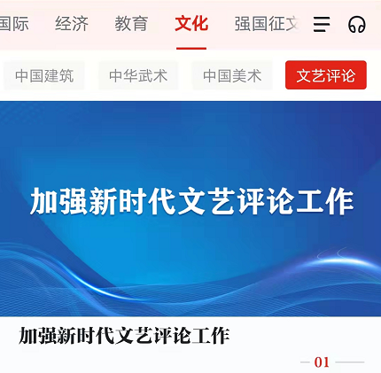 “文艺评论”频道设置在文化板块下,分为“政策理论”“热点观察”“文艺研究”“网络文艺”“传统文论”“影视评论”等栏目。