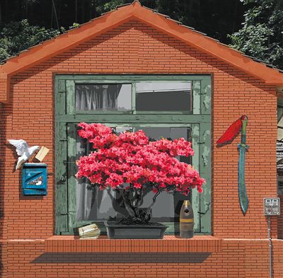 安徽省六安市霍山县诸佛庵镇丙烯壁画《窗前的杜鹃花》,中国美术学院绘画艺术学院师生集体创作。