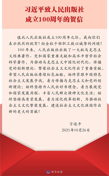 新华社北京10月26日电 在人民出版社成立100周年之际,中共中央总书记、国家主席、中央军委主席习近平发来贺信,表示热烈的祝贺,向全社干部职工致以诚挚的问候。