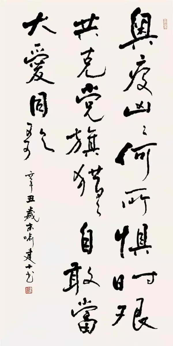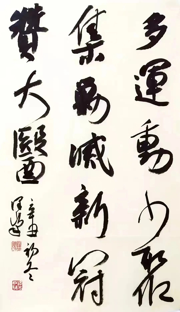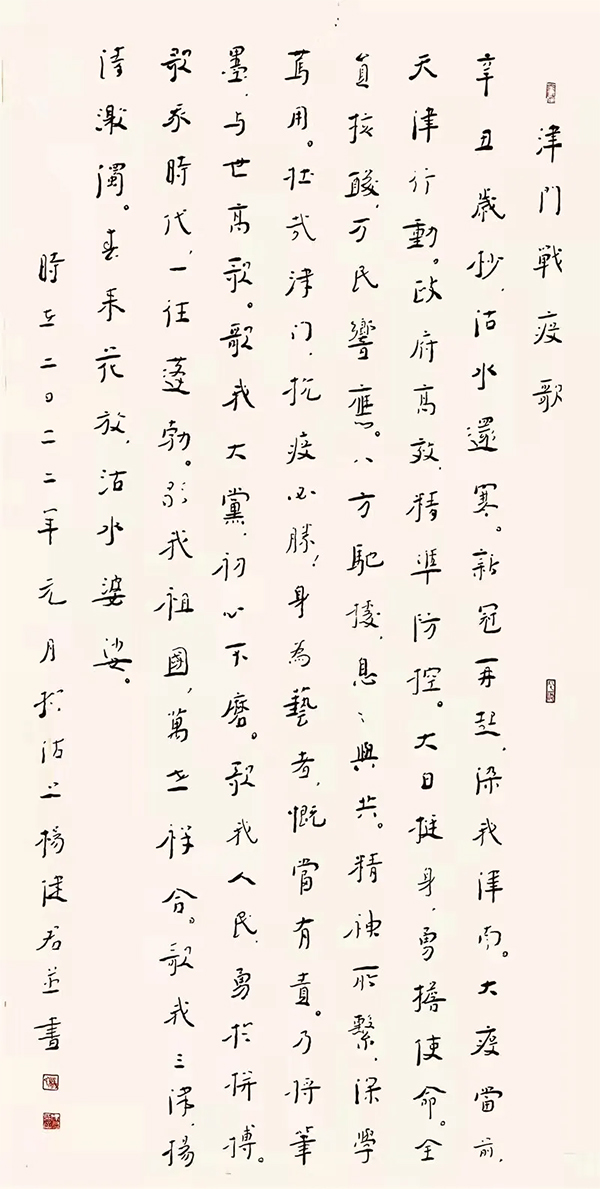 年近九旬的书法家孙伯翔主动请缨创作,并表示:“作为一名文艺老兵,我非常关心咱天津这次疫情,关心每一个天津人的安危,希望大家都健康、平安。我由衷地感谢连日来不顾严寒奋战在抗疫一线的‘战士’。大家勠力同心、共同抗疫,最终一定能战胜疫情,迎来火红热闹的新春佳节。”