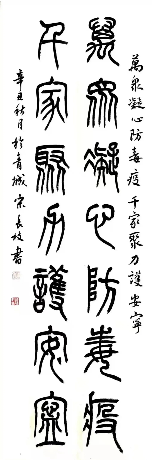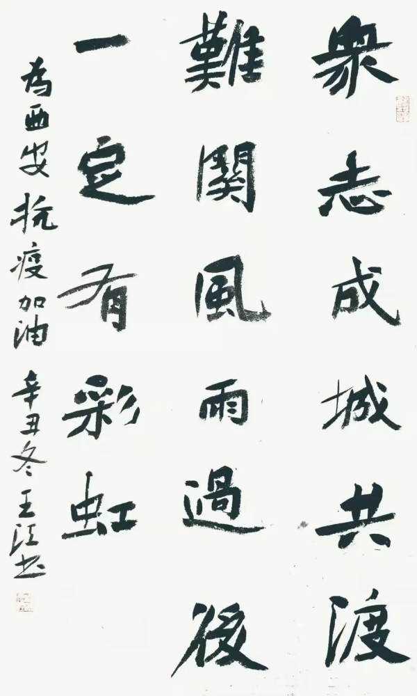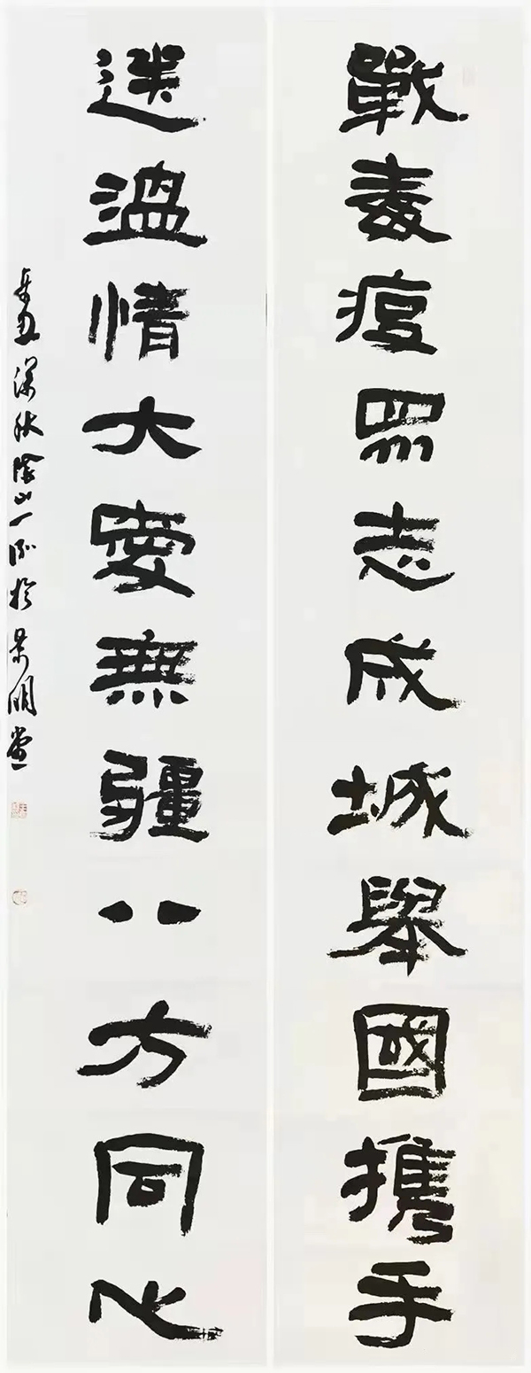 编者按:岁末年初,多地受到新冠疫情影响,给全国疫情防控工作带来了新的风险和挑战。习近平总书记强调,坚定信心、同舟共济,是战胜疫情的唯一正确道路。在党中央的坚强领导下,社会各界共同努力构筑起安全屏障。抗疫前线,文艺工作者从未缺席。天津、陕西、内蒙古书法界迅速行动,广大书家深入一线参加疫情防控志愿服务工作,并投入创作、捐赠作品,为抗疫凝聚文艺力量。众力并则万钧不足举,群智用则庶绩不足康。天地春晖近,疫情终会过去,我们静待花开。