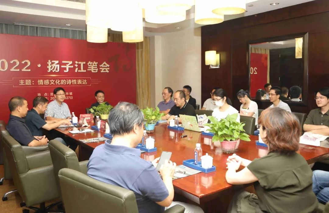 当晚举行的扬子江笔会则将“情感文化的诗性表达”作为对话主题。何言宏主持会议,周庆荣、崔国发、黑陶、桫椤、《苏州杂志》主编小海参与研讨。何言宏指出,诗歌理论是近年来国内外学术界比较显著的研究转向。在时代变革的大背景下,情感心理或许能够最直接地捕捉时代转型对人类生活和生命的微妙影响。联系到新诗领域,当代诗歌创作尤其是改革开放以来的诗歌创作在情感表达上呈现出了怎样的特点,体现了怎样的结构性特征?情感表达在当前诗学中有没有出现什么问题?由情感生发的诗学讨论源流众多,与会诗人、诗评家由不同视角出发,管窥汉语新诗的各类尝试和情感心理。周庆荣认为,人一生的诸多情感实则影响了我和我之外的关系,不同人生阶段的情感表达有不同的侧重点,诗人应注重内在的情感塑造和情感激发,将情感处理得更加含蓄更加饱满更加有力,形成情感的河床。崔国发由古典诗词理论的“兴观群怨”谈起,提出情感文化表达具有一体性;当代诗歌围绕诗歌中的情感表达歧见纷呈,经历了知识分子写作和民间立场写作的争论,以及主情派、主智派、情理兼顾派的各类尝试;主流诗歌写作逐渐由偏向抒情性转变成注重叙述性。桫椤则从另一角度追溯了当代诗坛的情感转型:在他看来,网络时代之前,诗歌的情感表达有总体性的趋向和共性,但进入互联网时代以后,诞生了海量的诗歌文本,诗歌情感表达呈现出多元化、个性化的显著特点;诗歌首先是内生的,但个性化的情感表达在丰富诗歌创作的同时,也引起了各种争议、讨论,诗歌生态变得空前复杂化。黑陶由古典诗歌传统谈起,提出中国诗歌使用汉字来完成诗歌书写,是表达诗歌情感的最好载体;一部中国诗歌史,就是一部中国人表达情感的历史;中国诗歌表达情感讲求“一切景语皆情语”,善于通过典型场景来体现情感的蕴藉含蓄之美。小海则主要以“第三代诗歌”为切入点,具体分析当代诗歌写作的情感转向。他认为,情感转向与叙事主体的变化具有密切关系,第三代诗歌标举的创作理念在当代诗歌史上具有革命性的影响,诗人由俯视式的抒情转而“生活在人群之中”,此后,诗人和读者站在平等视角,叙事主体带来的改变引起情感模式的转型,也生发了新的写作可能性。