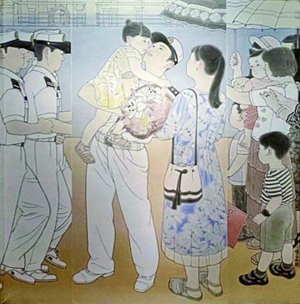 漫步军事题材美术作品的集中展示区域,一幅名为《护航归来》的工笔画作品吸引了记者的注意。与陈列在周围的表现军人坚韧不拔、英勇无畏的“硬汉风”作品有所不同,这件作品无论是画面主题还是设色风格都极尽柔情。身着白色海军军服的年轻军人在结束护航任务后与家人团聚,从妻子为他准备的鲜花和周围夹道欢迎的群众来看,他也许已经很久没与家人相见了。抱起又长高了不少的女儿,这位父亲脸上满是宠爱。“海军是我创作的重要对象,我从小在沿海城市长大,父亲是海军,大学又在解放军艺术学院学习,对于军人,我有着一份特殊的情感。”艺术家侯媛媛坦言,作品中那白得耀眼的军服,以及鲜花、国旗、太阳伞等细节都源于自己童年的记忆,充满着温柔的力量。