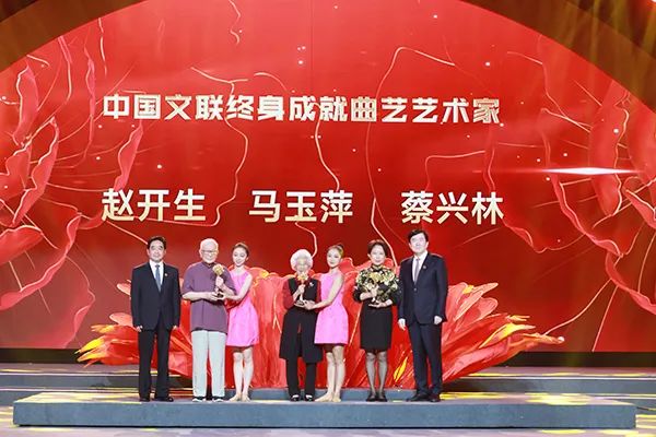 中国文联党组书记、副主席李屹,江苏省委常委、宣传部长张爱军为获得“中国文联终身成就曲艺艺术家”荣誉称号的赵开生、马玉萍、蔡兴林(家人代领)颁发荣誉证书。