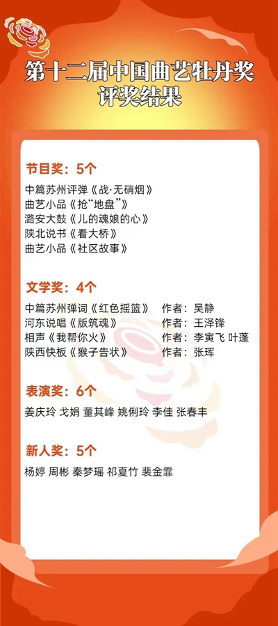 据悉,颁奖仪式后,来自全国各地的艺术家们将深入基层、走进校园,与广大群众共襄盛会、共享欢乐,开展“曲苑牡丹花正红”——第十二届中国曲艺牡丹奖获奖曲目惠民演出,“世界说唱嘉年华”——国际说唱艺术优秀节目专场展演,曲艺名家新秀“送欢笑到基层”专场汇报演出等活动。
