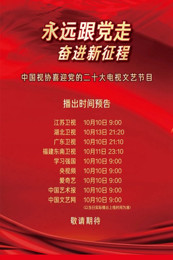 为迎接党的二十大胜利召开,以文艺的形式反映新时代中国在经济、政治、文化、社会、生态文明等各领域取得的光辉成就,展现广大电视和网络视听艺术工作者在党的领导下自觉承担举旗帜、聚民心、育新人、兴文化、展形象的使命任务和昂扬向上的精神风貌,由中国电视艺术家协会、江苏广播电视总台共同出品,中国文学艺术基金会、湖北广播电视台、广东广播电视台、福建省广播影视集团支持,中国视协主持人专业委员会、中国视协演员工作委员会协办的“永远跟党走 奋进新征程——中国视协喜迎党的二十大电视文艺节目”,已顺利完成录制工作,将于2022年10月10日起正式播出。