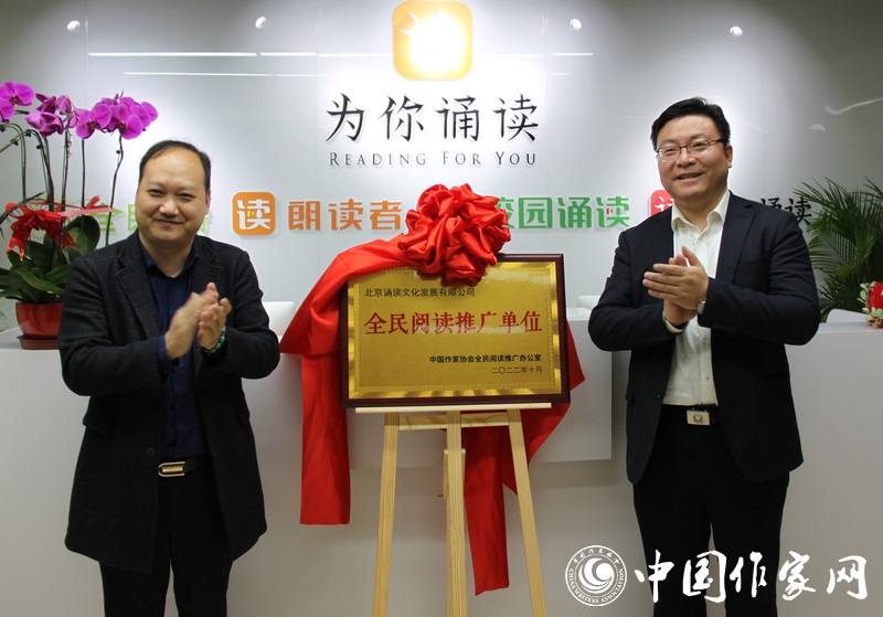 11月8日,中国作家协会全民阅读推广办公室授权北京诵读文化发展有限公司为“全民阅读推广单位”,授牌仪式在北京举行。这是中国作家协会全民阅读推广办公室授权的全国首家“全民阅读推广单位”。中国作家协会社会联络部主任李晓东、公共文学服务处处长刘戈、“为你诵读”App创始人项建新等参加仪式。