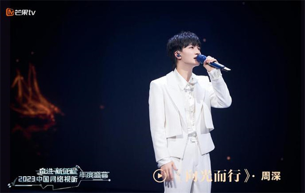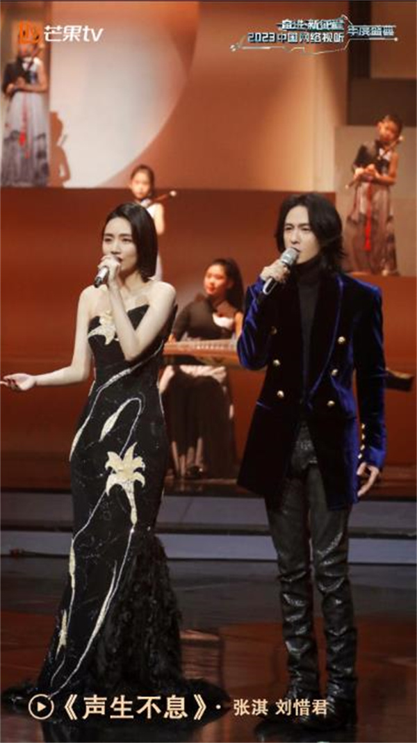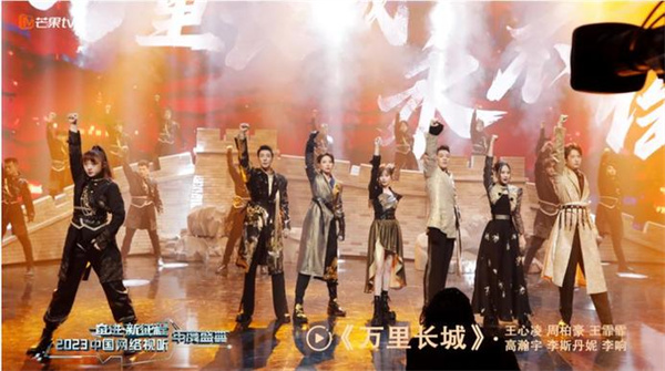 其三,以国风元素呈现“青春中国”新图景。近年来,推动传统文化创造性转化、创新性发展已成为网络视听行业的共同追求。国风、国潮便是从民族文化中提炼出来的精神标识,那么,异彩纷呈的创演舞台如何通过国风文化的创新融合为青春赋能呢?2023中国网络视听年度盛典中,节目《万里长城》融合了传统武术和国风唱演的表演形式,在长城舞台场景中利用3D立体卷轴、毛笔笔触文字、国潮撞色等文化元素,实现东方审美的视觉表达。长城的雄浑壮美、战甲式服装以及武术风格的舞蹈,共同呈现出和谐的整体美感,在审美层面传递华夏气韵、彰显时代精神。节目《声生不息》巧妙运用光影技术,致力于新潮元素的表达亦与古风相融。素雅的国风唐装配合舞台背后流动的水墨云雾之景,祥云、龙纹的中国元素与特效技术的舞台和谐交融,实现了中华传统美学与现代审美观念的深度结合。可以看到,网络视听节目以国风为媒引领青春新风潮,是融入传统文化视野和当代审美理念的一种艺术创造,既是古典的又是时尚的,从而产生出更持久、更磅礴的传承和创新力量。