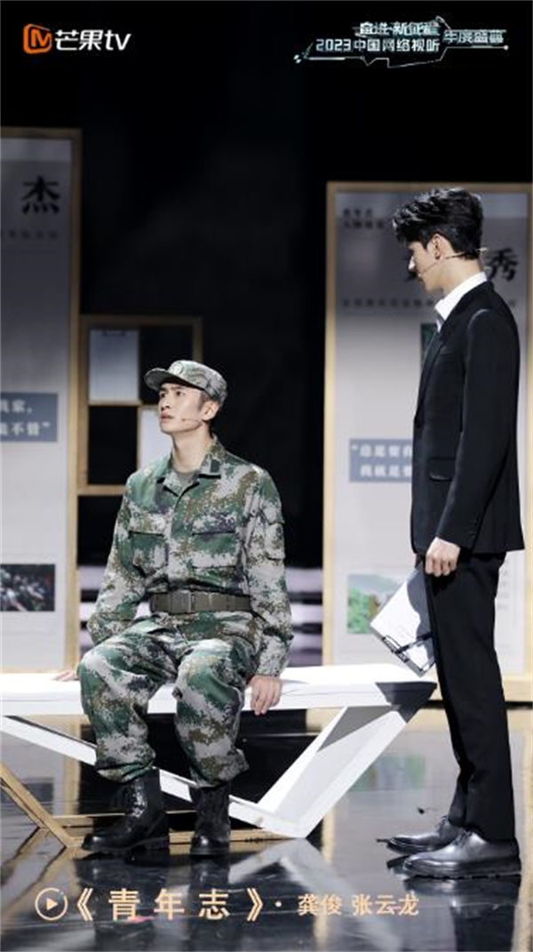 其二,以青年视角讲述奋进群像新故事。“人民”是文艺创作的源头活水,2023中国网络视听年度盛典以当代青年的视角,讲述多行业群体的奋斗故事与感人事迹,串联起中国人民团结向前的奋斗印记。一方面,致敬了奋战在一线的英雄形象。由张云龙、龚俊等演绎的跨时空对话情景剧《青年志》,聚焦“八一勋章”获得者杜富国的英雄事迹,通过“穿越”的表现方式,开启了一场时空穿梭与思想碰撞的青年对话,在一次次的询问战友、战场情况中用真情实感礼赞平凡英雄。另一方面,歌颂了坚守在普通岗位上平凡群体。节目《向光而行》借助VCR中真实景象和舞台空间的交叉融合,当代“愚公”毛相林、七一勋章获得者张桂梅、神十五航天员张陆等当代“追光者”一一闪耀荧屏,并以“那兔”形象刻画出万千中华儿女的奋斗群像,共同开启“想要富足的生活,就用我们的双手去创造”的奋进故事。节目《青年志》结尾以贾宗洋、黄文秀、龙麻子为代表的青年形象为落点,由点及面,彰显一代中国青年亘古不变的责任与担当。这些作品以凝心聚力的价值导向,在讲述中华儿女追梦、逐梦的奋斗故事之时,记录了他们不懈奋斗的精神历程。