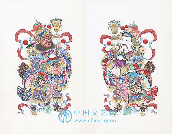 中国门神画先以虎作为题材,画于天子门上,到汉代才出现起源于古代神话故事的神荼、郁垒二人作门神的习俗。宋代,随着手工业空前发展,出现了木版雕刻刷印的纸质门神画,除传统的神荼、郁垒二人及武士,还出现了文臣朝官形象,形成了大门贴武士、院内厅堂两侧贴文官的风俗。自宋之后,门神的神性功能逐步淡化,门神形象多由通俗小说中的英雄人物担任。