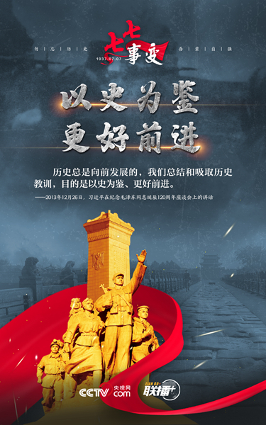 悼念同胞,缅怀先烈。勿忘历史,吾辈自强!在“七七事变”86周年之际,央视网《联播+》栏目特推出海报,与您一起从总书记讲话中汲取自强不息的奋进力量。