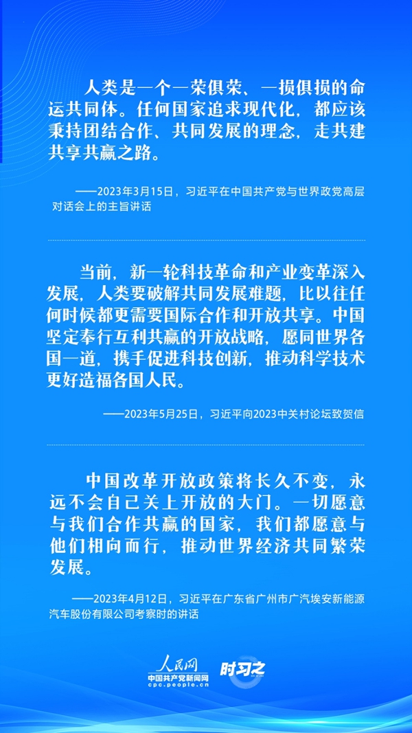 4月12日,习近平在广汽埃安新能源汽车股份有限公司考察时指出,中国改革开放政策将长久不变,永远不会自己关上开放的大门。一切愿意与我们合作共赢的国家,我们都愿意与他们相向而行,推动世界经济共同繁荣发展。