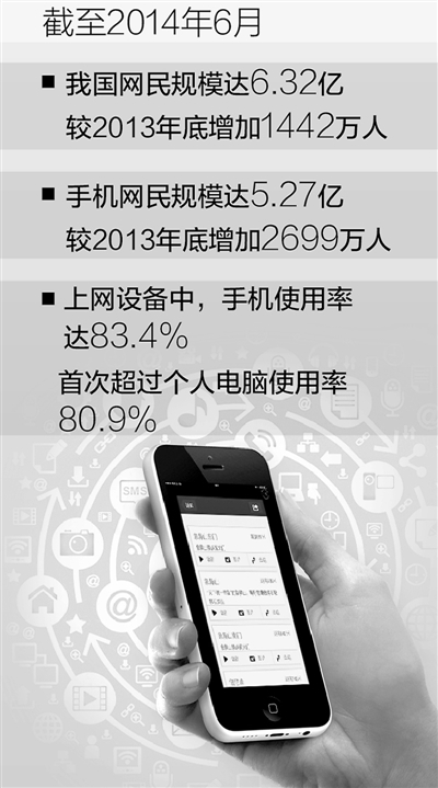 报告显示,截至今年6月,我国网民规模达6.32亿,较2013年底增加1442万人。互联网普及率为46.9%,较2013年底提升了1.1个百分点。手机网民规模达5.27亿,较2013年底增加2699万人。手机上网的网民比例为83.4%,相比2013年底上升了2.4个百分点。台式电脑和笔记本电脑上网网民比例略有下降,分别为69.6%和43.7%。手机上网比例首次超越传统个人电脑上网比例(80.9%)。同时网民在手机电子商务类、休闲娱乐类、信息获取类、交流沟通流类等应用的使用率都在快速增长,带动整体互联网各类应用发展,推动网民生活的进一步互联网化。