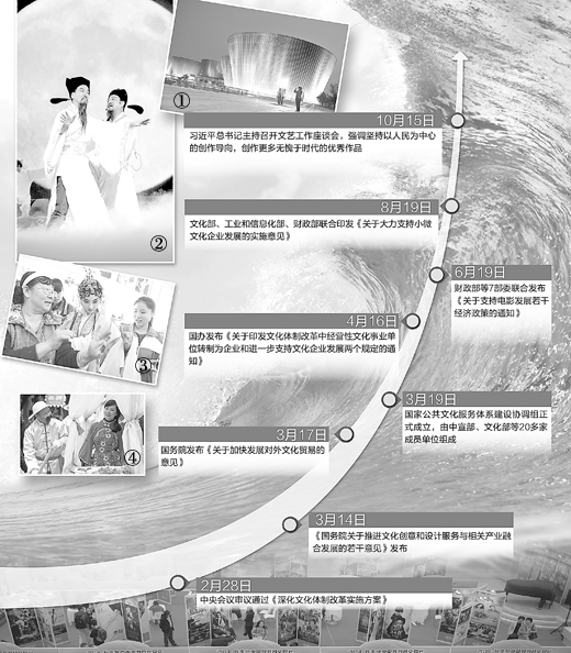 2014年2月,中央全面深化改革领导小组审议通过《深化文化体制改革实施方案》,明确了新一轮文化体制改革的路线图、时间表、任务书。中央和有关部门制定出台了一系列文化经济政策,《关于深入推进文化金融合作的意见》《关于大力支持小微文化企业发展的实施意见》《关于推进文化创意和设计服务与相关产业融合发展的若干意见》……利好政策之多而密集在10余年来的文化体制改革历程中可谓空前。