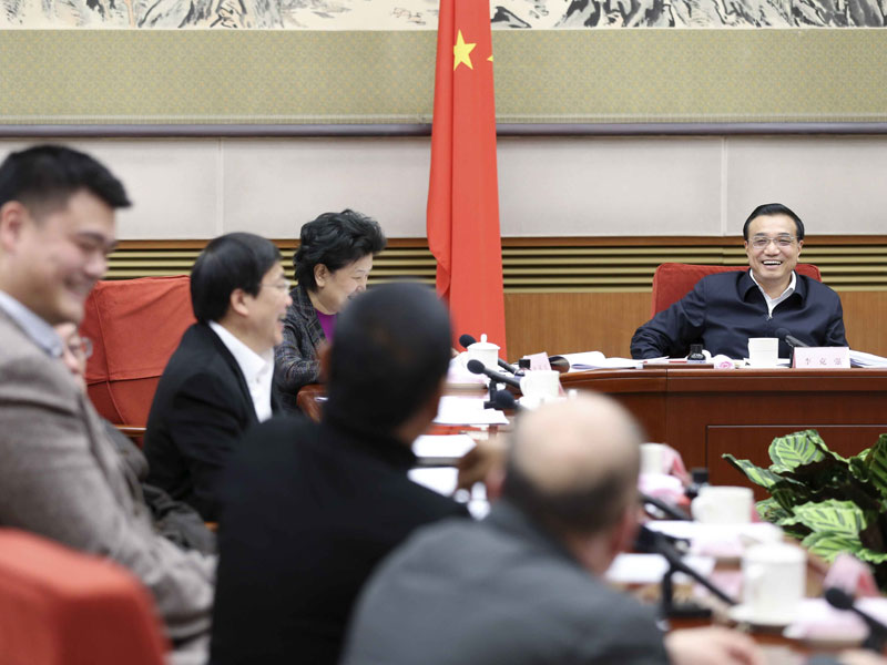 会上,复旦大学许宁生希望加大教育投入、促进教育公平。工程院院士张尧学建议加强创新文化和学术环境建设。作家王蒙提出要树立正确的创作导向,完善文化评价和激励机制。中国医学科学院肿瘤医院赫捷对提高我国癌症防控能力谈了看法。篮球运动员姚明建议改革体育管理体制,为体育产业发展“松绑”。影视演员陈道明提出要推出更多有国际影响力的影视作品。李克强认真听、仔细记。他说,教科文卫体等社会事业是创造价值、引领发展的事业,在这些方面提供更好的公共产品和服务,既是惠民生,也能促发展、调结构。政府责无旁贷地要加大支持力度,同时要把投入的钱用好,各方都来出力,把社会事业建成全社会共同参与、共同受益的事业。