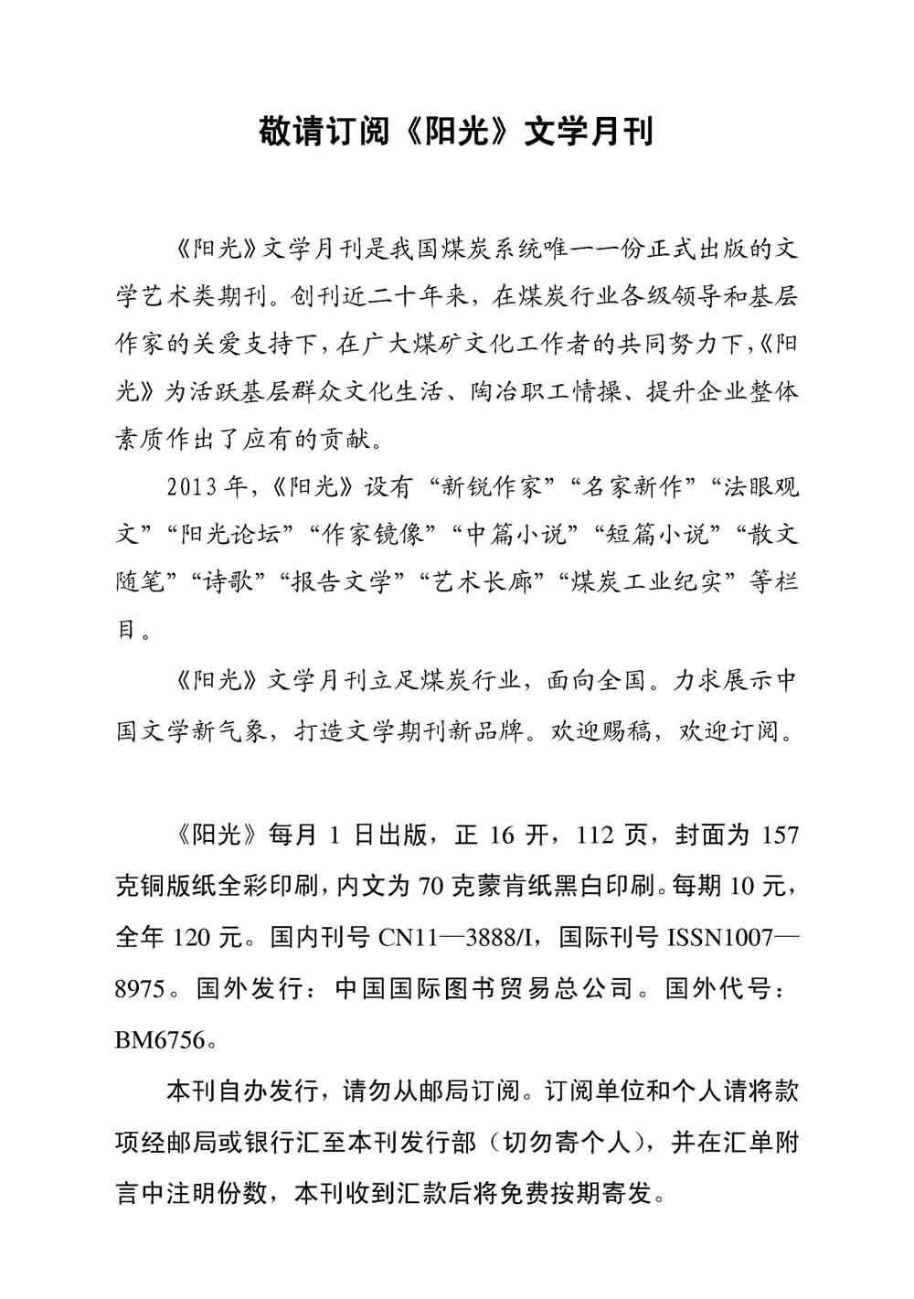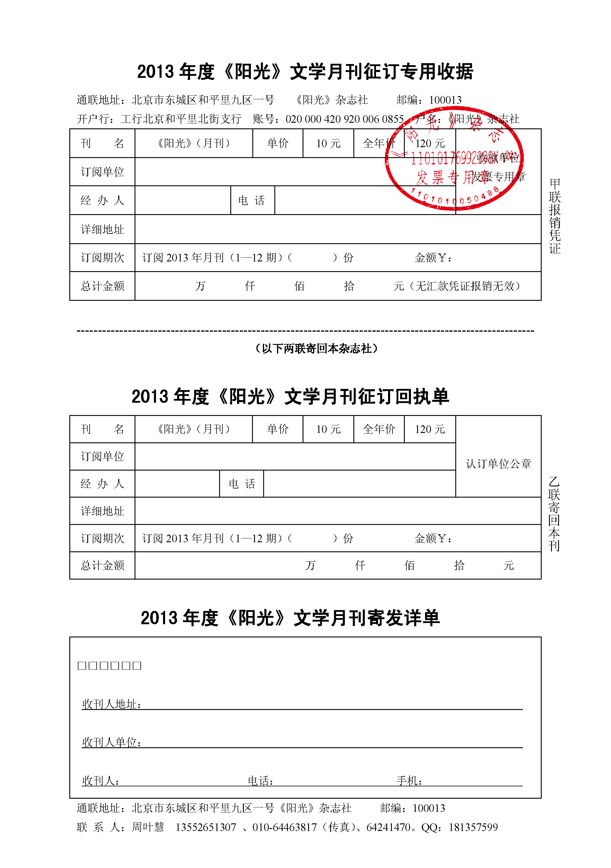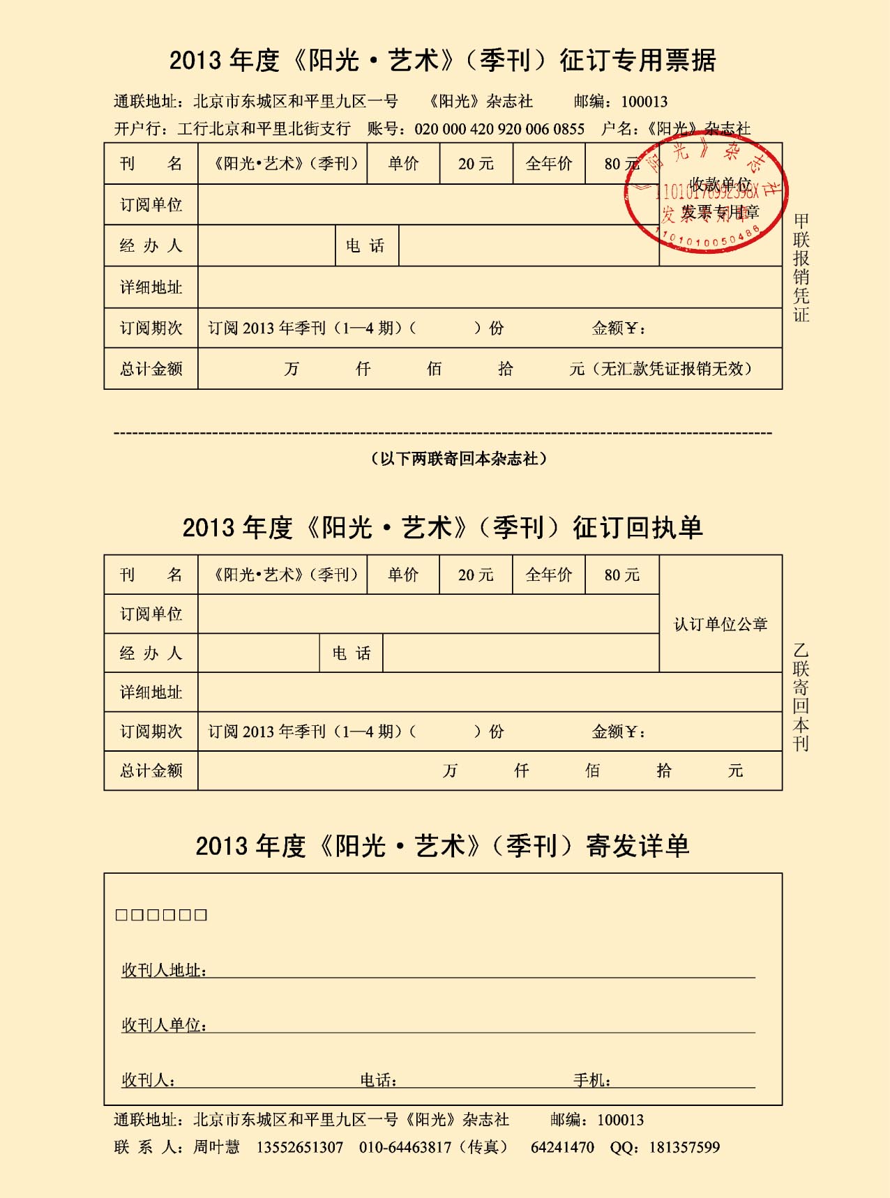 2013年《阳光》文学、艺术征订单 来源:中国煤矿文化网 作者:阳光杂志社 时间:2012-10-09 【字体:小 大】 附: 2013年度《阳光》艺术季刊征订专用收据 2013年度《阳光》文学月刊征订专用收据 分享到: 【打印正文】