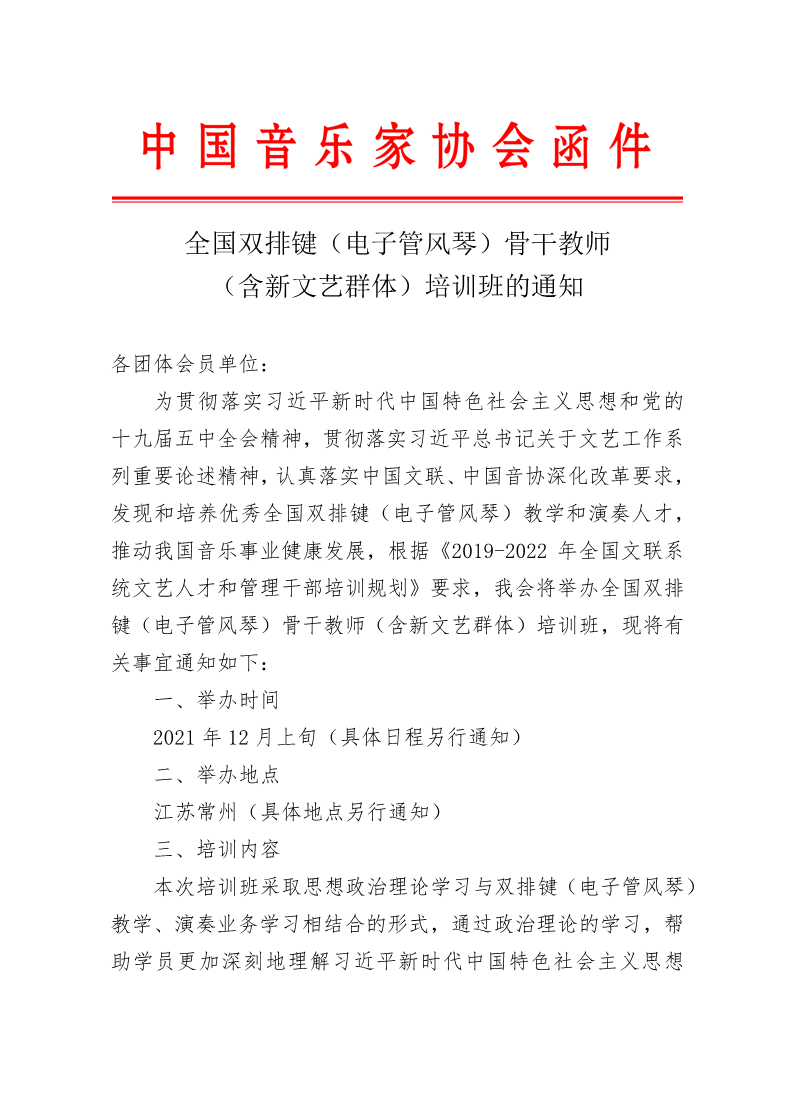 转发中国音乐家协会《全国双排键(电子管风琴)骨干教师 (含新文艺群体)培训班的通知 》